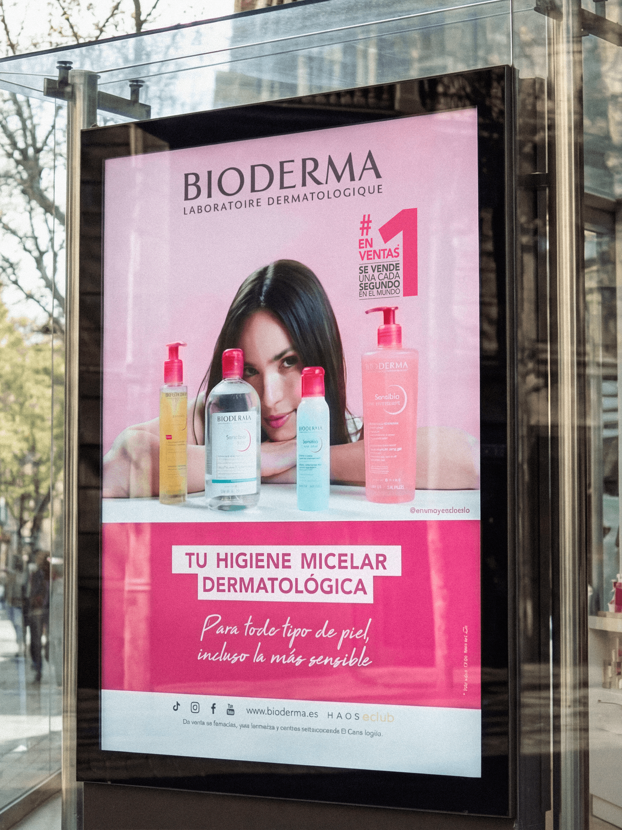 Art directed a full campaign for Bioderma's Agua Micelar featuring influencer Ana Moya. The project spanned from TV and social media video production to paid static assets and out-of-home placements — MUPIs included. A single creative concept executed across every format and surface.